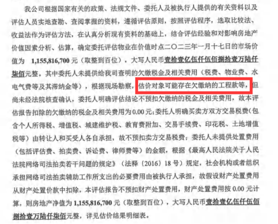 根据此次拍卖评估报告,开发商可能存在在欠缴纳的工程款。深圳市中级人民法院发布的执行裁定书显示,原申请执行人中原信托有限公司与被执行人有7亿元的财务纠纷,法院裁定,强制拍卖、变卖被执行人深圳半岛城邦置业有限公司名下位于深圳市南山区望海路的83套房产以清偿债务。