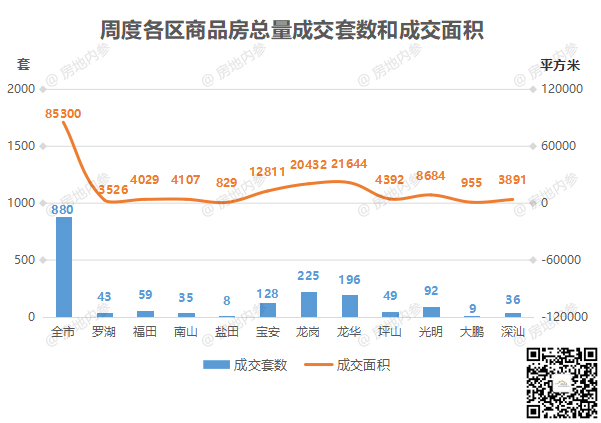 深圳全市开发商品房共成交880套,环比↓12.61%;成交面积85299.96㎡,环比↓20.10%。