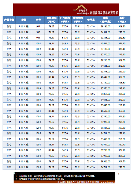 龙岗区天祺苑 1 栋 A~C 座住宅开盘备案价格表
