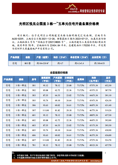 光明区悦见公园里 3 栋一~五单元住宅开盘备案价格表
