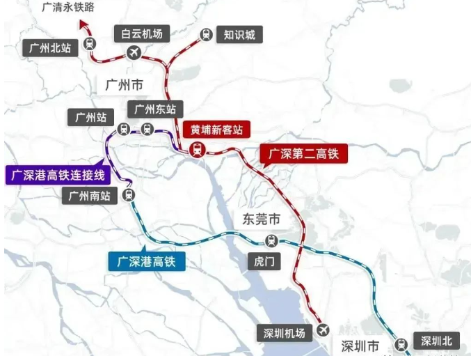 据规划,该高铁还经前海,南延联系香港,衔接深圳北站至香港,未来可望接上港深西部铁路项目,连通香港交椅洲人工岛乃至香港机场,至此,广深港三大机场有望一线互通。