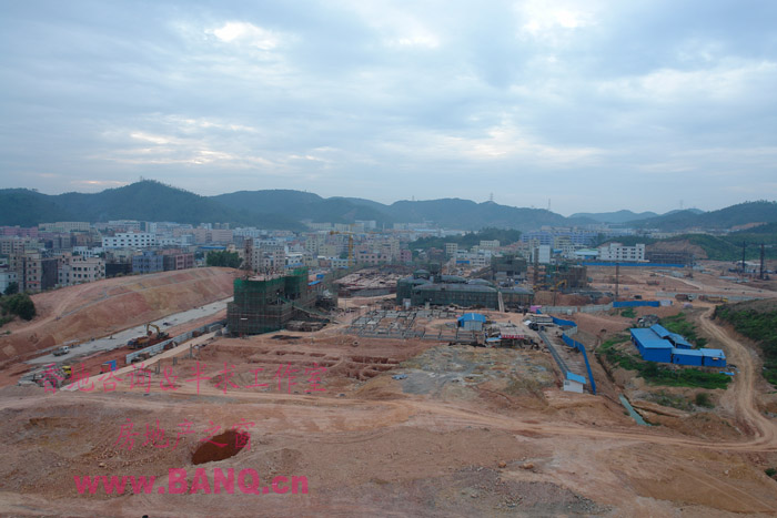 从工地现场来看,施工最快的是会所,会所主体已经封顶,另有三栋刚出地面二层,其他正在进行地基和道路的施工,紧临山体的地方正在平整土地,出街广告及其他标识也还没做好。