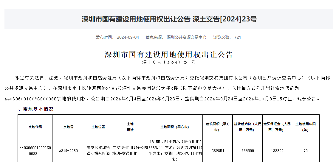 宗地挂牌起始价66.65亿元,竞买保证金13.33亿元,土地使用年限70年。