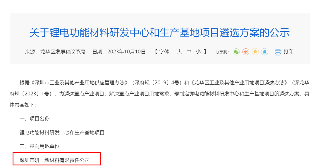 2023年10月,深圳市龙华区发展和改革局发布关于《关于锂电功能材料研发中心和生产基地项目遴选方案的公示》,项目意向用地单位为深圳市研一新材料有限责任公司。