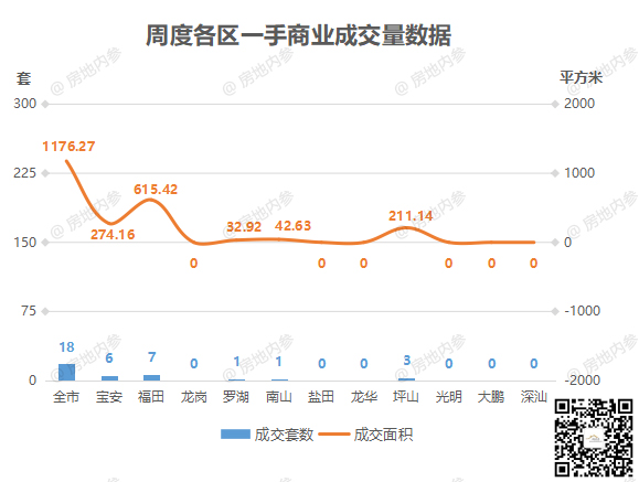 ②商业,成交18套,环比↓53.85%;成交面积1176.27㎡,环比↓32.66%;