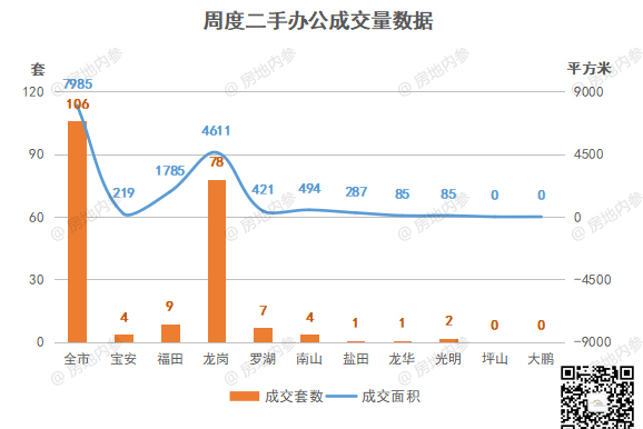 二手房办公成交方面,全市成交106套,成交量前三区域分别是: