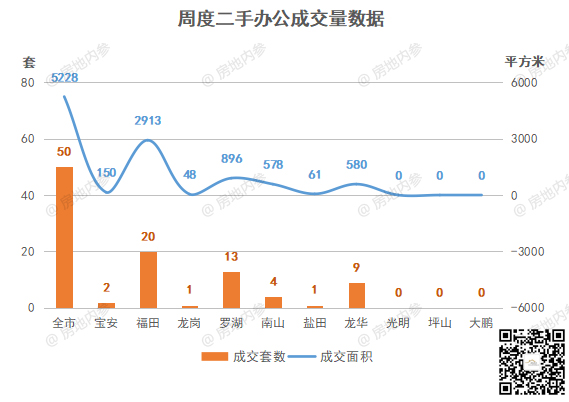 二手房办公成交方面,全市成交50套,成交量前三区域分别是: