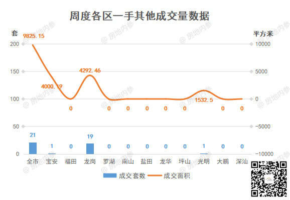 ④其他,成交21套,环比↓12.50%;成交面积9825.15 ㎡,环比↑117.26%。