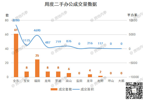 二手房办公成交方面,全市成交61套,成交量前三区域分别是: