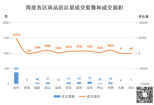 深圳全市开发商品房共成交382套,环比↓11.37%;成交面积47925.09㎡,环比↓55.57%。