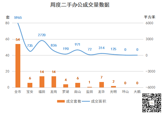 二手房办公成交方面,全市成交54套,成交量前三区域分别是: