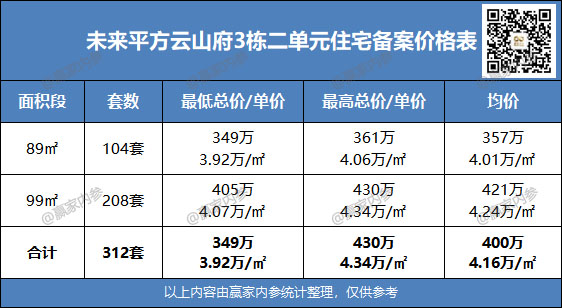 ♦备案产品:312套住宅,户型建面约89-99㎡,备案均价4.16万/㎡