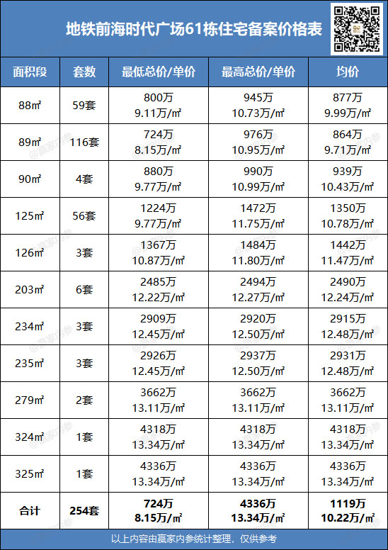 南山区地铁前海时代广场61栋住宅开盘备案价格表