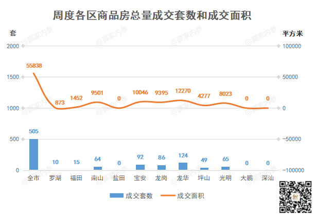 深圳全市开发商品房共成交505套,环比↑37.98%;成交面积55838.28㎡,环比↑21.24%。