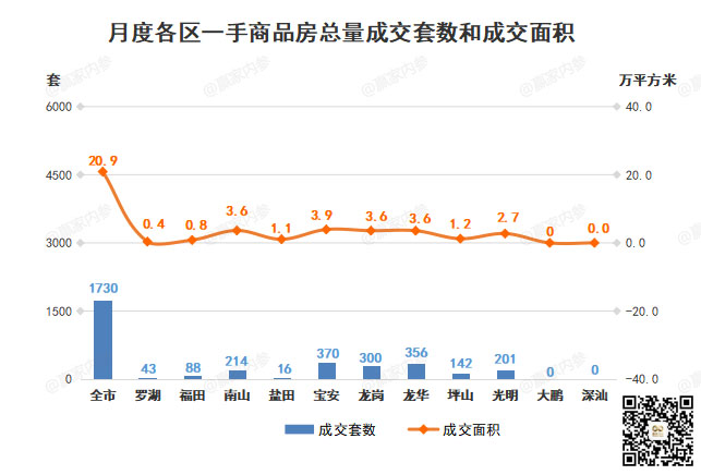 深圳全市开发商品房共成交1730套,环比↑35.90%;成交面积209114.48㎡,环比↑72.21%。