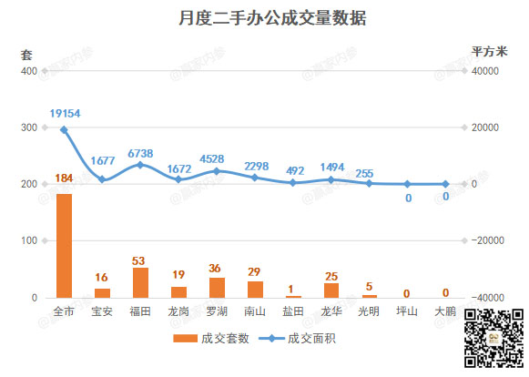 二手房办公成交方面,全市成交184套,成交量前三区域分别是: