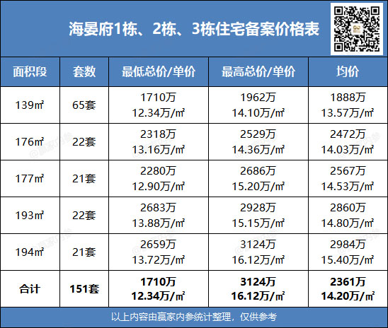 ♦备案产品:151套住宅,户型建面约139-194㎡,备案均价14.20万/㎡