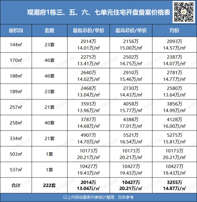 ♦备案产品:222套住宅,户型建面约144-537㎡,备案均价14.87万/㎡
