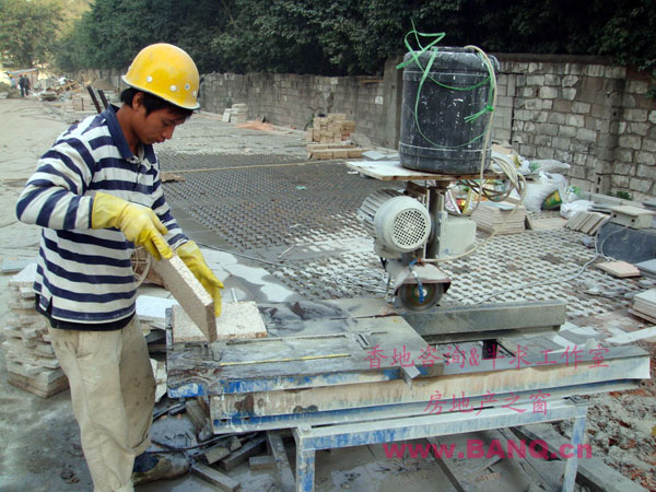 在幼儿园广场上,摆放着一台精密石材料加工机械,全部需要切割的花岗石、大理石都由这部机械负责,与那些采用手工机械制作的工程相比,这里的切割精度当然不可同日而语。机械的说明是:“本机床适用于……精密石材开料……锯切口高度光滑平整……精度高,误差不超过0.3毫米!”。
