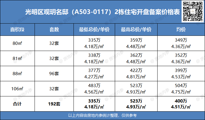 光明区观玥名邸(A503-0117)2栋住宅开盘备案价格表